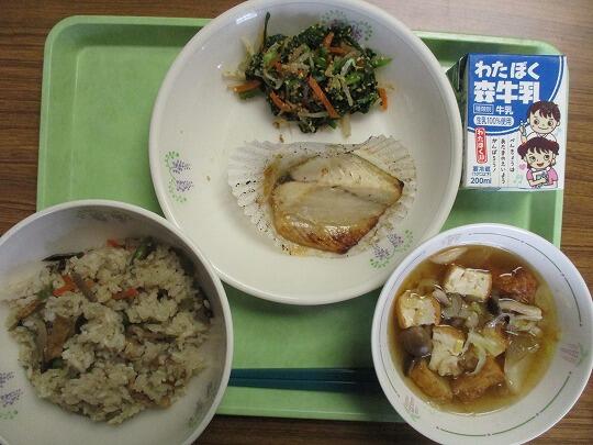 ごはん、牛乳、ゼリーフライ、おひたし、凍り豆腐の煮物でした。