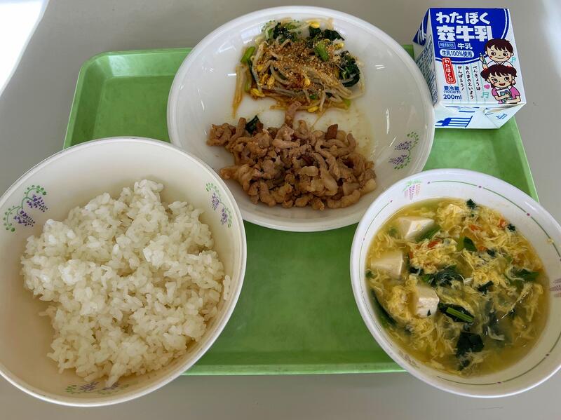 もやしそば(中華麺、汁)、牛乳、彩の国肉まん、小松菜のソテー、キャラメルポテトでそた。