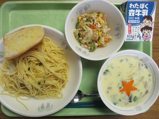 ガーリックフランス、スパゲッティ、小松菜クリーム、牛乳、チキンサラダでした。