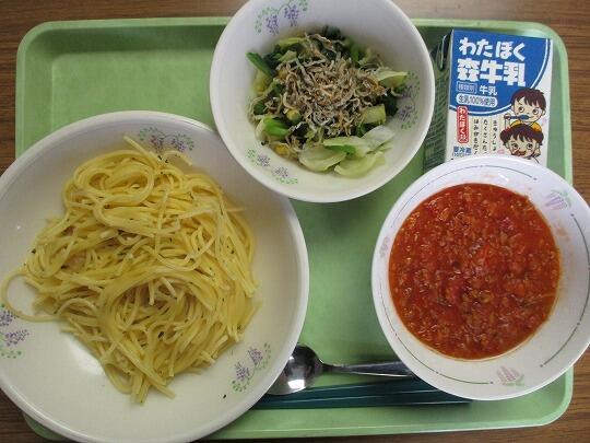 スパゲティ、ミートソース、牛乳、青菜とじゃこのサラダで