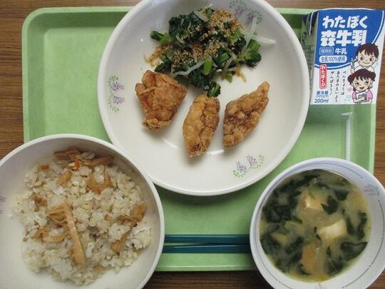 たけのこごはん、牛乳、鶏肉のから揚げ、ごま酢和え、みそ汁でした。