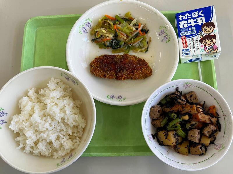 ごはん、牛乳、アジフライ、おかか炒め、磯煮でした。
