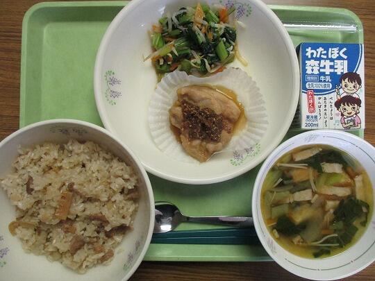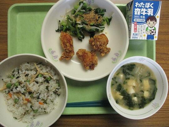 ピース入りわかめごはん、牛乳、鶏肉のから揚げ、ごま酢和え、みそ汁でした。