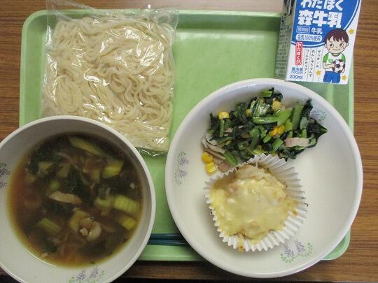 ラーメン(中華麺、汁)、牛乳、ポテトのチーズ焼き、小松菜のソテーでした。