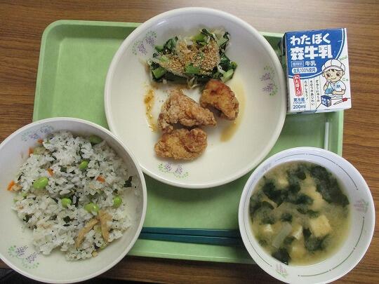 枝豆入りわかめごはん、牛乳、鶏肉のから揚げ、ごま酢和え、みそ汁でした。