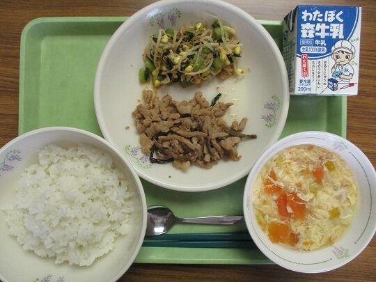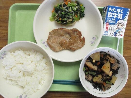 ぎはん、牛乳、豚肉の生姜焼き、みそ和え、磯煮でした。