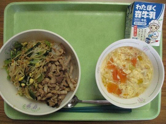 ビビンバ【ごはん、具(肉)、具、野菜)】、牛乳、トマトと卵のスープでした。