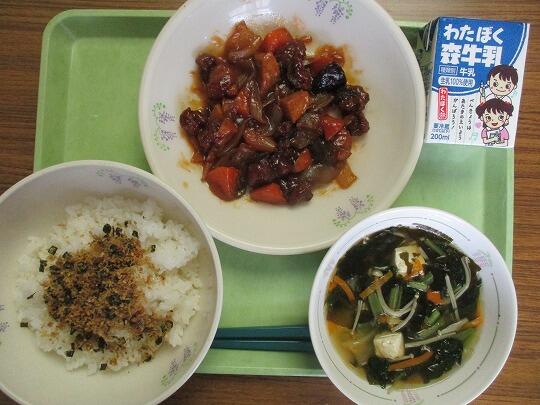 ごはん、牛乳、手作り大豆ふりかけ、酢豚、わかめスープでした。