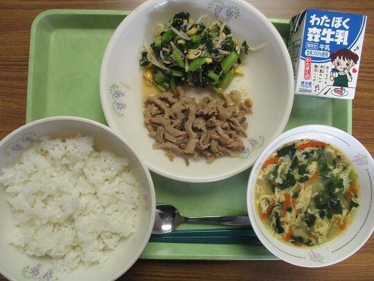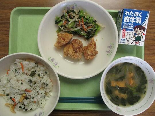 わかめごはん、牛乳、鶏肉のから揚げ、ごま酢和え、みそ汁でした。