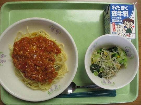 スパゲッティ、ミートソース、牛乳、青菜とじゃこのサラダ、セレクトデザートでした。