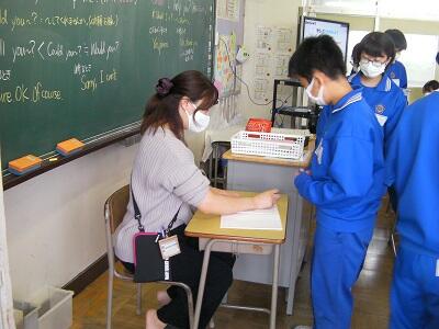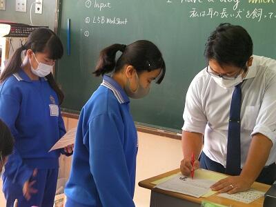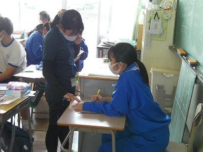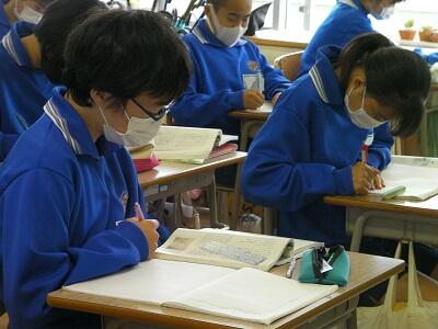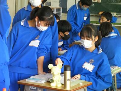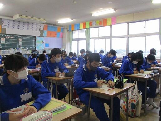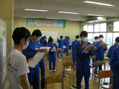 3年生音楽です。「若人の歌」について、先生のアドバイスを受けています。