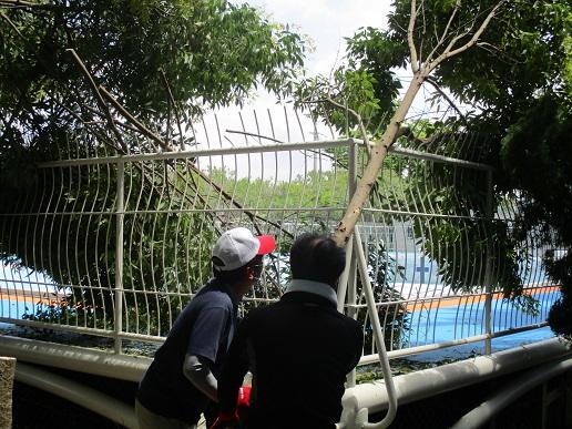 市の職員の方々が、プール周辺の木々を