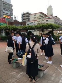 今日は修学旅行初日です。春日部駅前に集合し、担任の先生に出発チェックを受けています。