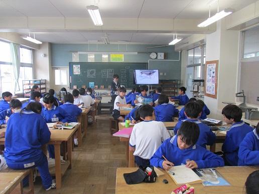 2年生社会です。日本の工業について学んでいます。外国との貿易摩擦について先生が話されているところでした。