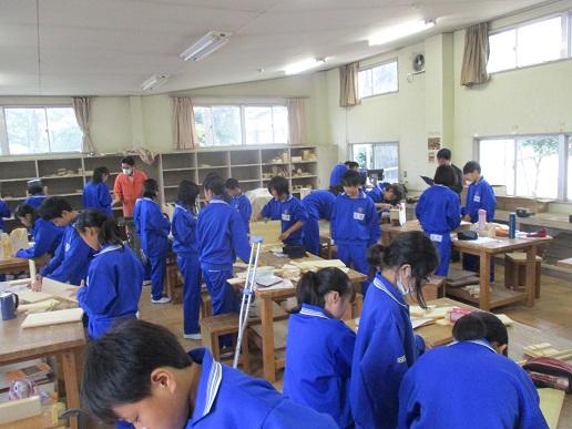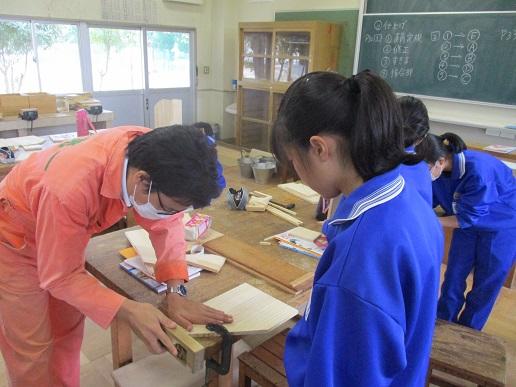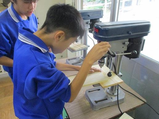 1年生の技術家庭科では、木材を加工してファイルボックスをつくる授業を行っています。今日は教育実習生の研究授業であったため、大学の先生にも授業を見ていただきました、生徒は釘を打つための穴をあけたり、鉋を使って木材の長さを整えたりするなど、集中して製作に取り組んでいました。