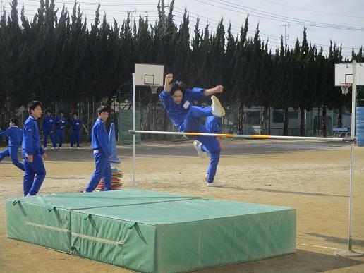 3年生保健体育です。女子が校庭でハードル、男子がバスケットボールコートで走り高跳びを行っています。