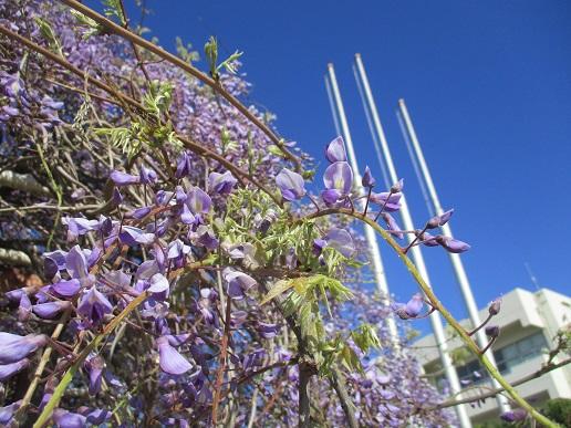 4月17日金曜日です。昇降口付近にある藤棚では、藤の花が咲き始めていました。先日から、用務員さんが昇降口周辺の草をきれいに刈り取ってくれています。いつもありがとうございます。昭和53年3月にご卒業された第1回卒業生の記念の石碑が、今も残っています。