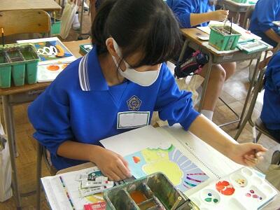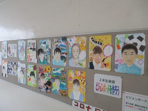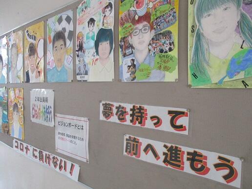 2階渡り廊下です。2年生美術「ビジョンボードを作ろう」が掲示されています。