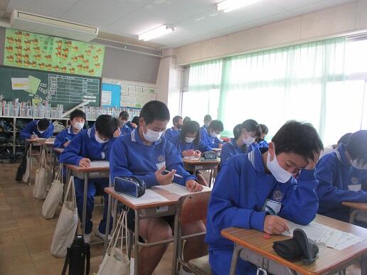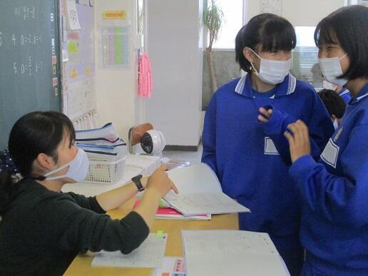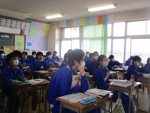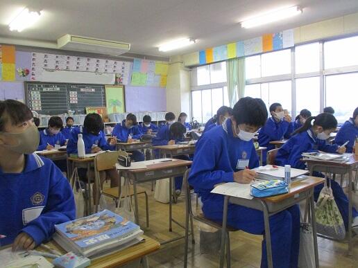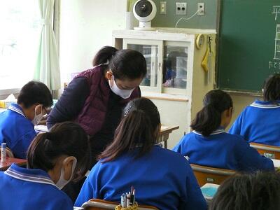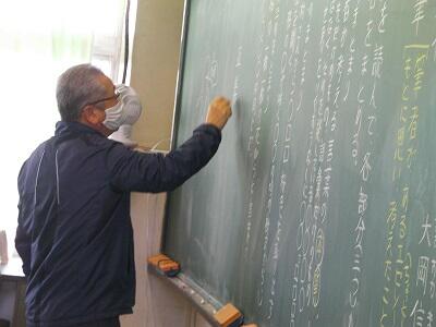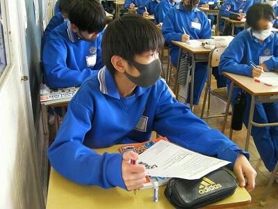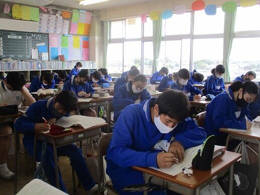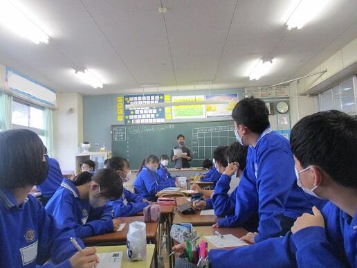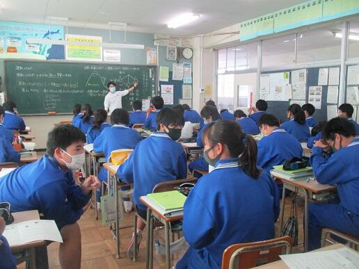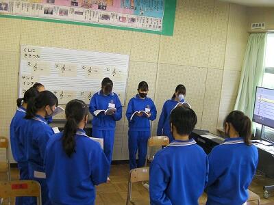 3年生音楽です。「若人の歌」について、先生のアドバイスを受けています。