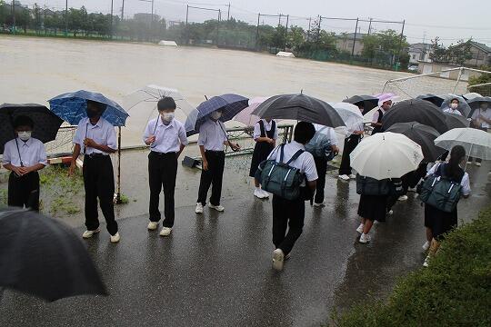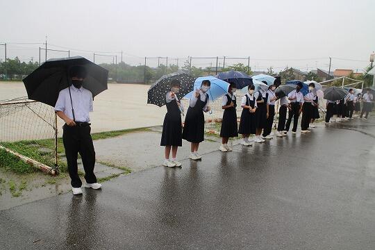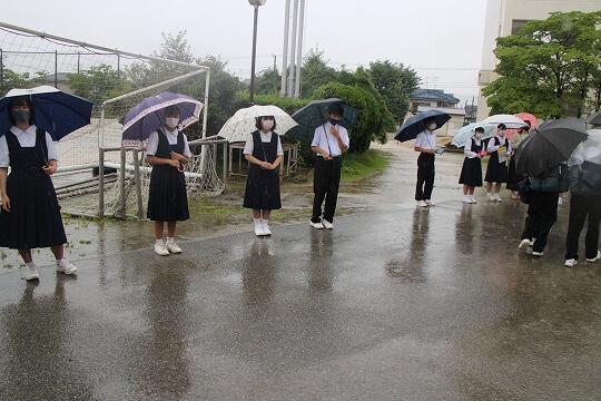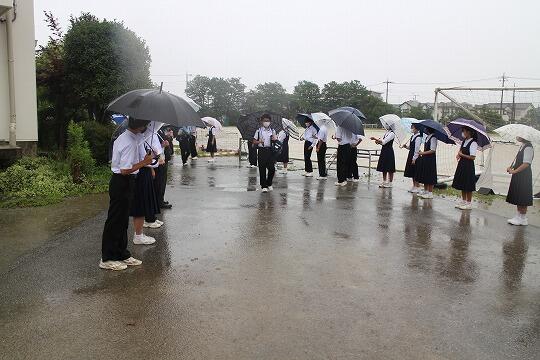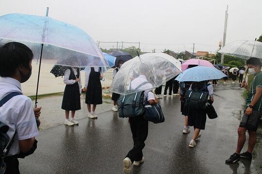 大降りの雨の中にもかかわらず、さわやかなあいさつが響き渡る沼中のさわやかな光景です。