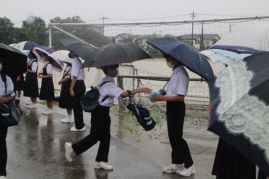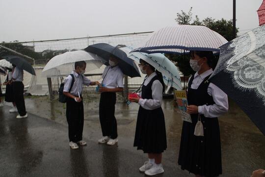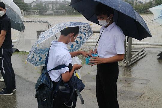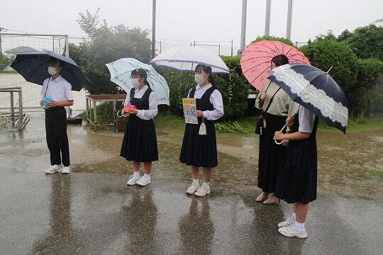 大降りの雨の中、生徒会本部役員が医療従事者の方々へ支援をする募金をしていました。