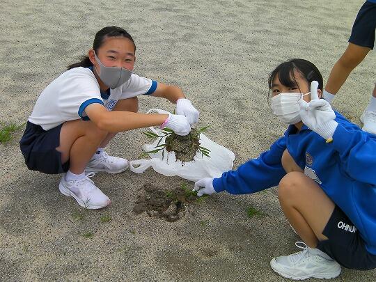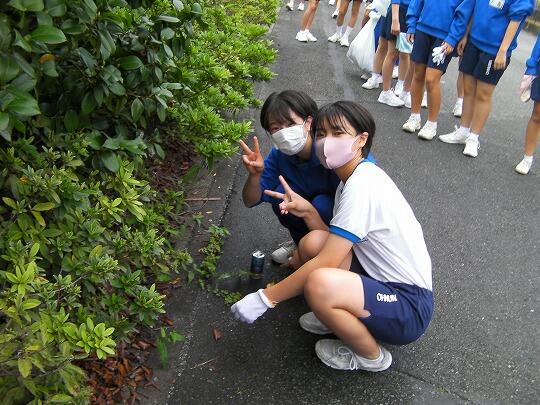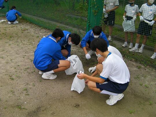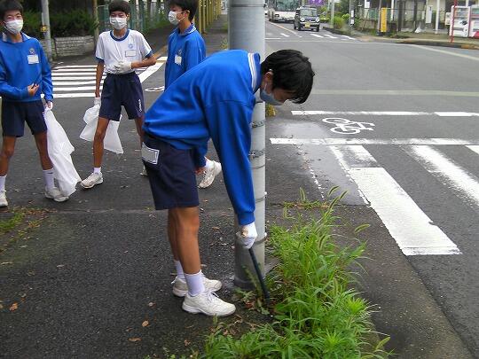 本日、朝、生徒のボランティア精神を養うために3年生が地域清掃、1、2年生が校内除草を行いました。