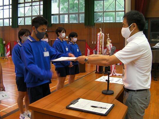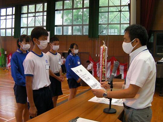 終業式終了後、表彰を行いました。第1学期の沼中生の頑張りで、今日の表彰は、学校総合体育大会(水泳)と県の硬筆展の表彰でした。