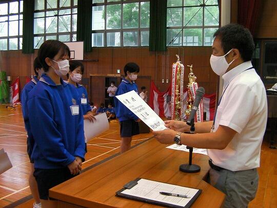 表彰される生徒のみ体育館へ集合し、ライブ映像を各教室で視聴するリモートの形式で行いました。