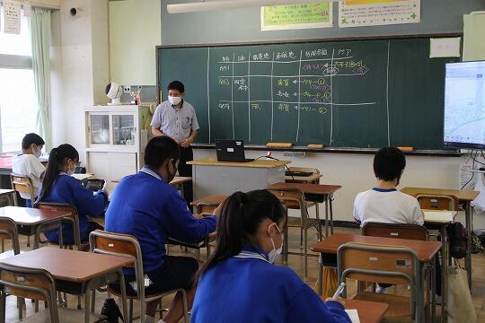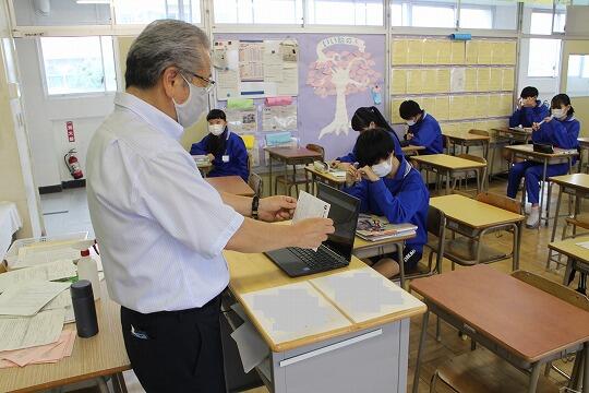 オンラインでプリントを示したり、やりとりをしたりしながら授業を展開していました。オンラインによる授業は、まだまだ、課題はありますが、『配られたカードで勝負する』大沼中学校です。