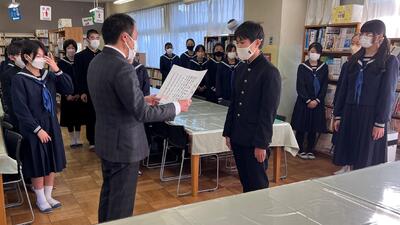 23日(金)に終業式が行われました。各学年代表生徒が2学期の反省と3学期の抱負を発表してくれました。また、表彰も行われ、今回もたくさんの人が表彰されました。おめでとうございます。