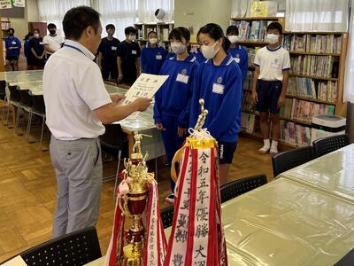 本日は、オンラインによる表彰朝会が行われました。学校総合体育大会地区予選会と通信陸上競技大会埼玉県大会の表彰でした。剣道部、卓球部、サッカー部、ソフトボール部、女子バレーボール部、陸上競技部、柔道、水泳の各部活動のたくさんの生徒が表彰されました。