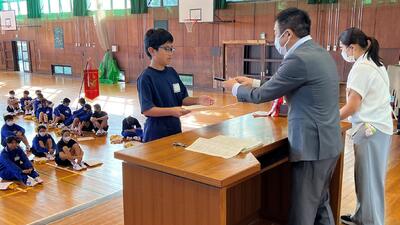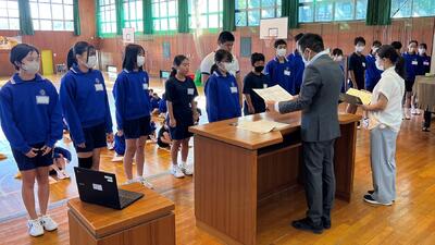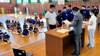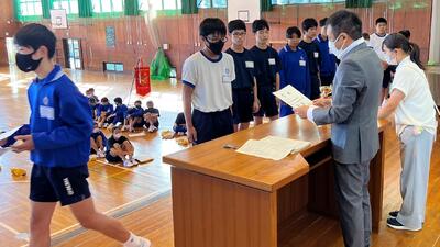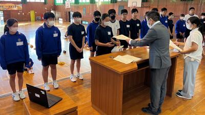 先日生徒会役員選挙で選ばれた新生徒会役員の任命式が今朝行われました。今まで大沼中を支えてきた旧生徒会の皆さんお疲れ様でした。新生徒会役員の皆さんはこれから大沼中の更なる発展に尽力してください。旧生徒会から新生徒会への記念品も贈られました。