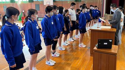 本日は表彰朝会が行われました。新人体育大会、ポスター・人権作文・読書感想文・書道コンクールなど、のべ6団体、48個人が表彰されました。詳しくは、学校だより10月号をご覧ください。たくさんの生徒の活躍素晴らしいです。