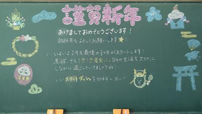 今日から3学期が始まり、各教室には担任からのあいさつが書かれていました。