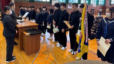 26日(火)に、令和5年度修了式を体育館で行いました。各学年に修了証を授与し、代表生徒の1年間を振り返って・進級にあたっての抱負の発表がありました。校長式辞では、みなさんの成長と来年度沼中を背負っていく自覚が伝わった1年だったことなどを話されました。式後、書きぞめや美術展、コンテストや運動部の大会等、今回もたくさんの表彰がありました。