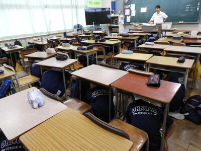 シェイクアウト訓練は、地震の際の安全行動1-2-3「まず低く、頭を守り、動かない」を身につけます。