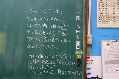 このホームページのトップページには、「今年一年はどうでしたか…、来年はどんな年にしたいですか…」というメッセージがあります。また、昨日から三者面談(二者面談)が始まり、2学期がんばったことや課題を担任の先生と確認していますね。2学期の終わり、そして今年の終わりの時期ということもあり、「振り返り」をする時期ですね。「勉強をがんばった」、「部活動をがんばった」、「係や委員会活動をがんばった」とみなさん色々なことをがんばりましたね。またその一方で不十分な取り組みで反省したり、しなければいけない事を怠けてしまい、その結果良い成果を残せなかったりと反省する人も少なくないのではないでしょうか…。人は弱い生き物ですから、つい怠けてしまったり、さぼってしまったりしますよね。ここで大切なことは、そういった自分でも嫌いにならないで、「自分はやればできる!」、「よし、大丈夫、次がんばろう!」という気持ちを持つことです。この気持ちを持てれば、今後の成長に近づくのです。
