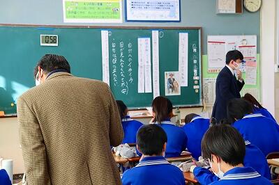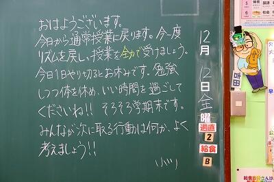 12月も第2週目となり、登校日も残すところ13日となりました。朝晩の寒さも厳しくなりました。先週は2年生がインフルエンザの蔓延により3日間の学年閉鎖となりました。また、先週は新入生一日入学が行われ、地域の6年生が来校しました。一日一日、1つ1つが確実に進み、2学期のゴールが見えてきました。まずは健康第一です。風邪やインフルエンザに気をつけましょう。また、3学期には、1年生はスキー教室、2年生は東京校外学習、3年生はいよいよ受験が控えています。2学期の残りと冬休みも気を緩めることなく、行事の準備や学習をがんばっていきましょう。(校長)