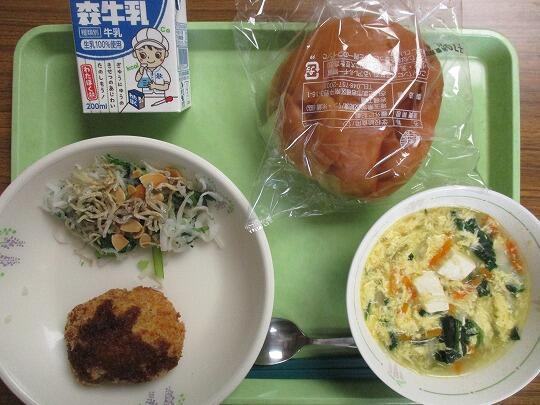 こどもパン、牛乳、そら豆入りコロッケ、パリパリサラダ、レンフォアタンでした。