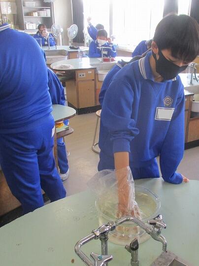 水の中に手に入れると締め付けられるような感覚になるという感想を言いながら実験に取り組んでいました。