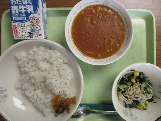 カレーライス(麦ごはん、、ルウ)、牛乳、福神漬け、鉄骨サラダでした。