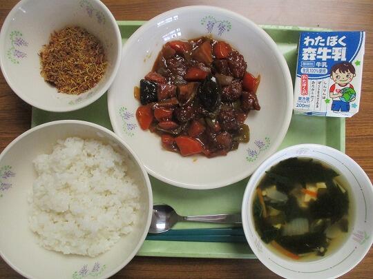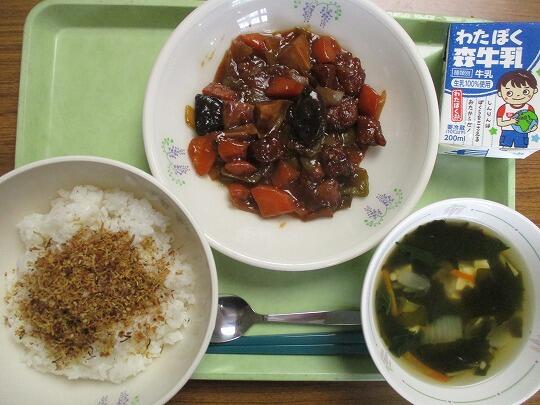 ごはん、手作り大豆ふりかけ、牛乳、酢豚、わかめスープでした。