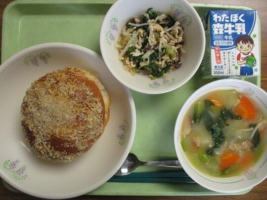 焼きカレーパン、牛乳、バンバンジーサラダ、じゃがいものコンソメスープでした。