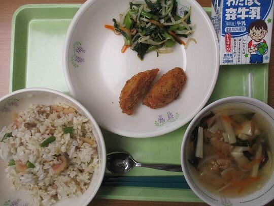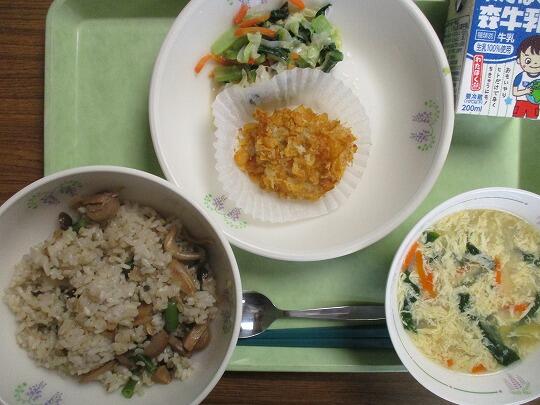 きのこピラフ、牛乳、チキンのこんがり焼き、コールスローサラダ、洋風かきたまスープでした。