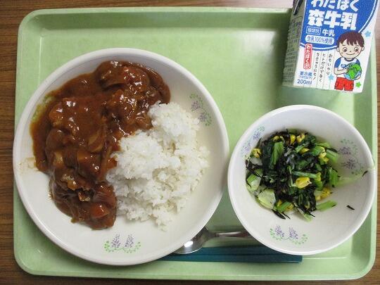 ハヤシライス(麦ごはん、ルウ)、牛乳、鉄骨サラダでした。