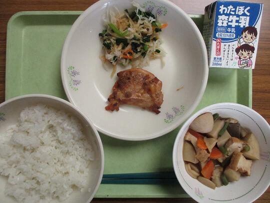 ごはん、牛乳、鶏肉の秩父おなめ焼き、切り干し大根の和え物、里芋といかの煮物でした。