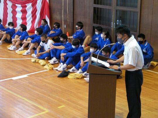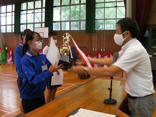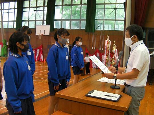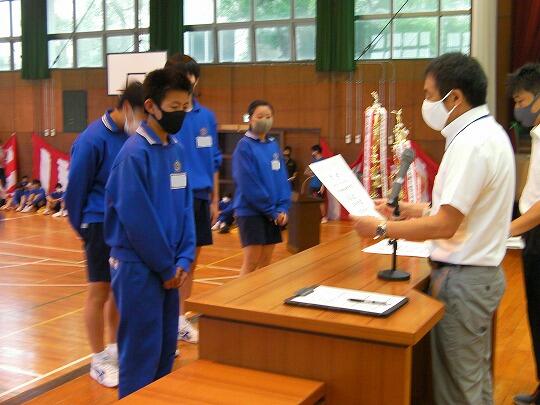 表彰されたのはサッカー部(高円宮杯市内2位)、女子ソフトテニス部(学総大会市内3位)、女子バスケットボール部(学総大会市内3位)、男子バレーボール部(協会長杯市内1位、学総大会埼葛3位)、女子バレーボール部(会長杯市内1位、学総大会市内2位)、男女剣道部(男女とも団体戦市内1位、個人戦男女とも1位から5位までを総なめにしました)、ソフトボール部2埼葛地区1位)、陸上競技部(通信陸上大会、共通男子800m市内3位、1年男子1500m市内1位、県大会1年男子1500m3位、学総大会(共通男子800m市内3位、1年男子1500m市内1位、共通女子砲丸投げ市内2位)男子卓球(学総大会団体戦3位)女子卓球(学総大会個人戦シングルス1位)でした。沼中生の頑張りが光った1学期で、本日の表彰朝会では表彰しきれないうれしい悲鳴です。