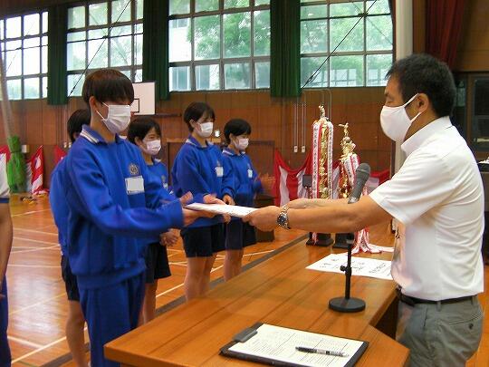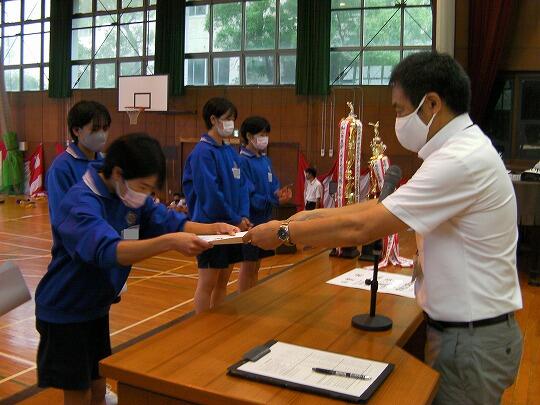 表彰される生徒のみ体育館へ集合し、ライブ映像を各教室で視聴するリモートの形式で行いました。