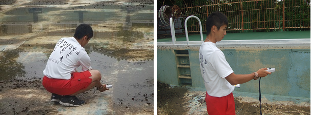 学校のプール清掃前に、水抜き後の泥水の放射能測定を行いました。プール内の数ヶ所で測定を行い、安全を確認しました。(6月7日(火)8:30~9:00 天候:晴 微風 プール内汚泥と水たまり)これを受けて、6月9日(木)、13日(月)にプール清掃を行いました。今年も安全第一で水泳指導を行ってまいります。保護者の皆様のご協力をお願いいたします。