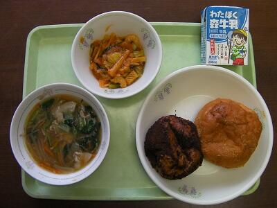 二色揚げパン、牛乳、いかとえびのチリソース煮、ワンタンスープでした。